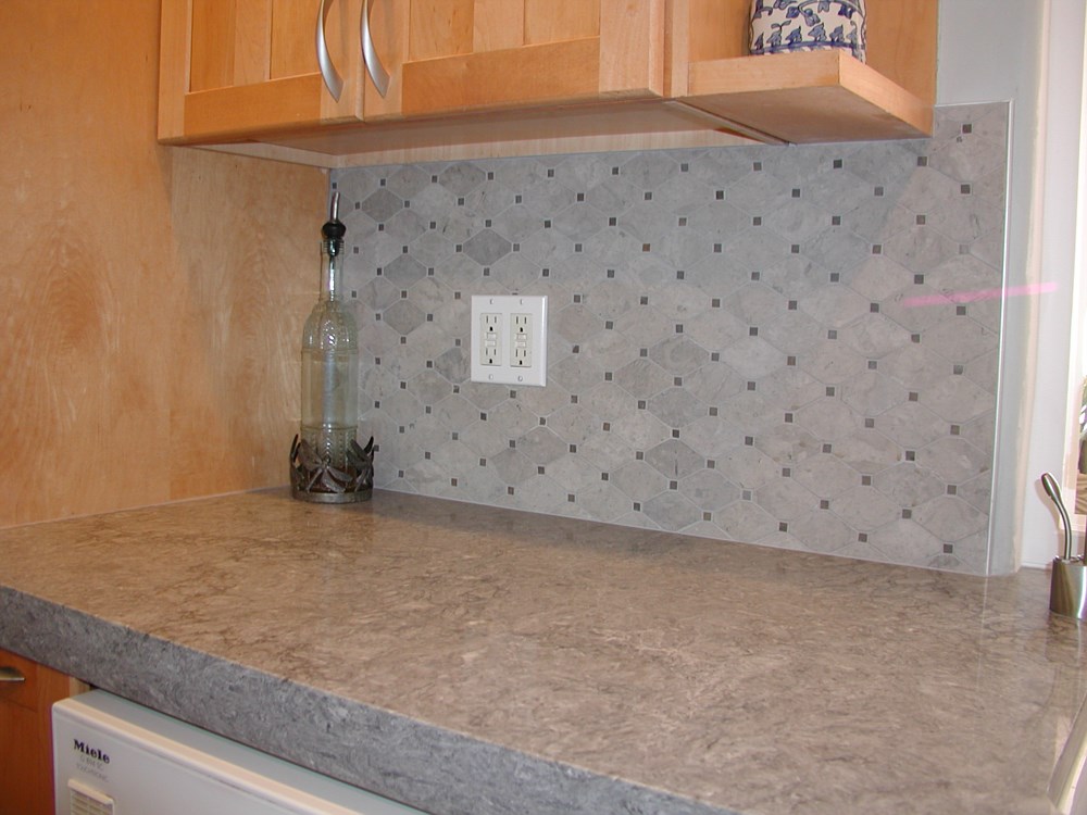 The home was extensively remodeled approximately 12 years ago. The home included smooth wall finishes and hardwood floors throughout. These customers wanted to update their kitchen with new quartz countertops, tile splash, and pass-through kitchen window. The job would have been relatively easy but the customer wanted the exiting eating bar lowered approximately 6'' to a standard bar height and wanted to make the eating area longer and wider. This required that the supporting wall be cut down and the counter height electrical outlets be lowered. New ½'' cantilever brackets were installed to support the weight of heavy elbows. To prevent dust from migrating through the entire house a temporary plastic containment wall was erected to separate the work area from the rest of the house.Zipper doorways were installed so the family could access all areas of the house after work hours. Protective cardboard materials were applied to the hardwood floors to prevent them from damage during the entire project. A high-efficiency particulate air (HEPA) negative air system was installed to contain the dust within the work area. As a second measure to contain the dust a HEPA vacuum was used. The customers selected 3cm Caesarstone #6313 quartz, Turbine Grey with a matching mosaic tile backspalsh.